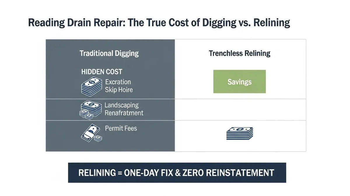 Avoid costly, messy excavations. Compare Camberley Drain Relining vs Digging to save your home, time, and money with our expert, minimally invasive, and durable no-dig repair solutions for local drains.